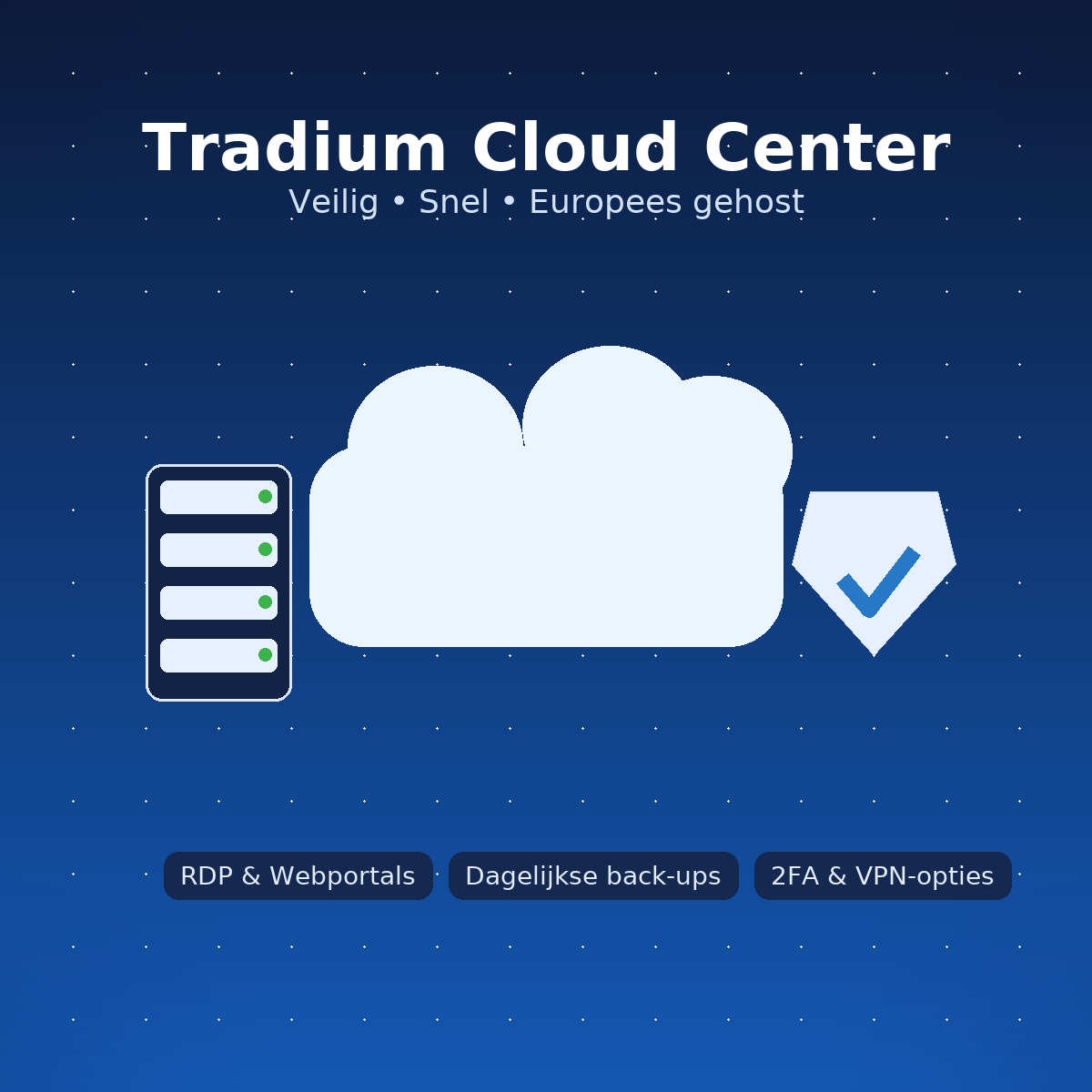 Draai Tradium als SaaS in ons eigen Nederlandse cloudplatform — of kies voor on-premises. Jij beslist, wij beheren. Data blijft in Nederland/EU en je logt in via RDP of webportals.